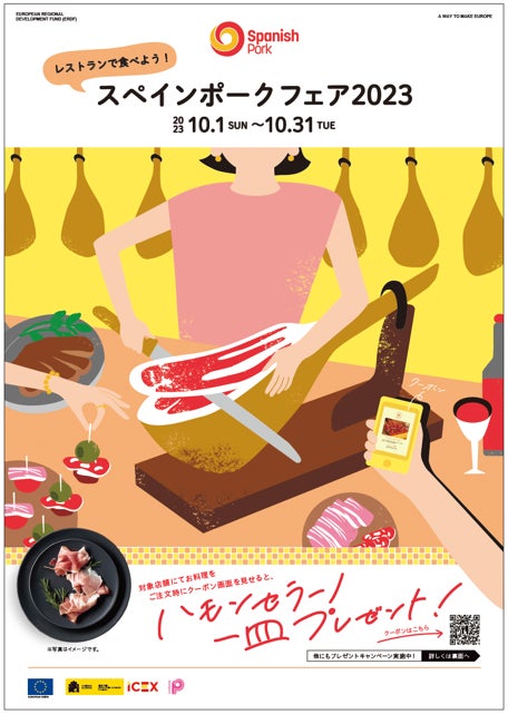 10月1日(日)〜31日(火)、首都圏を中心とするスペインレストラン55店舗が参加して行われる『スペインポークフェア 2023』では、対象店舗へ食事に行き、注文時にクーポンを見せるとスペインが誇る最高峰の生ハム、ハモンセラーノ(スペイン産白豚もも肉を塩漬けしたもの)を一皿無料で提供するキャンペーンを実施します。スペイン有数の生ハム生産地で海塩だけで16ヶ月熟成したハモンセラーノをお店でカットしたものなどをご提供します。※数に限りがございます。