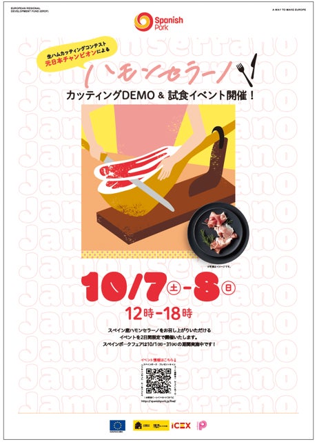 10月7日(土)、8日(日)の12:00〜18:00に、ハモンセラーノカッティングコンテスト元日本チャンピオンのコルタドール(生ハムをカットする職人)による、ハモンセラーノカッティングデモと試食を、b8ta Tokyo – Shibuya(所在地:東京都渋谷区渋谷1丁目14番11号 小林ビル1階 営業時間: 11:00 – 19:30)で実施します。生ハムはカットにより味が大きく左右されます。大きな原木から均等な厚さにカットするには鍛錬した技術と生ハムに対する専門知識が必要で、そうした専門技術を有し、カットする職人を「コルタドール」と呼びます。イベントでは、スペイン有数の生ハム生産地で海塩だけで20ヶ月熟成したハモンセラーノ原木を両日各1本(400-500人分)用意しています。プロによる切り立てのおいしさと、部位によって違う味わいをお楽しみください。さらに、簡単なアンケート回答などでもらえるバッグやハモンセラーノ、チョリソなどのプレゼントも実施します。