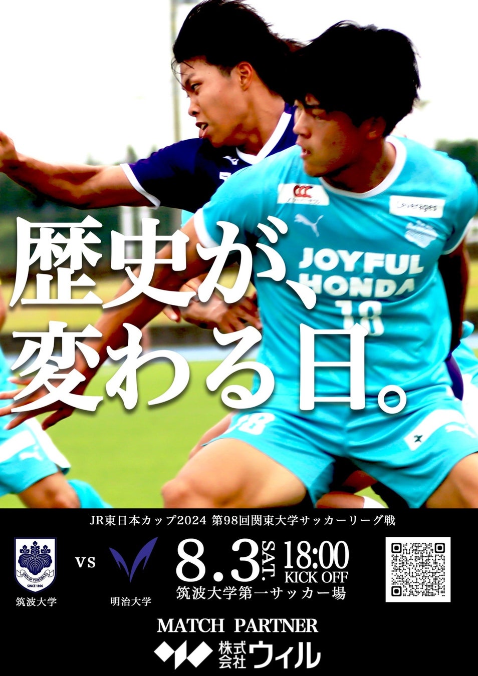 株式会社ウィルは、来る8月3日(土)、筑波大学で開催されるJR東⽇本カップ2024 第98回関東⼤学サッカーリーグ戦【1部】第13節 筑波大学vs明治大学のマッチパートナーに就任しました。