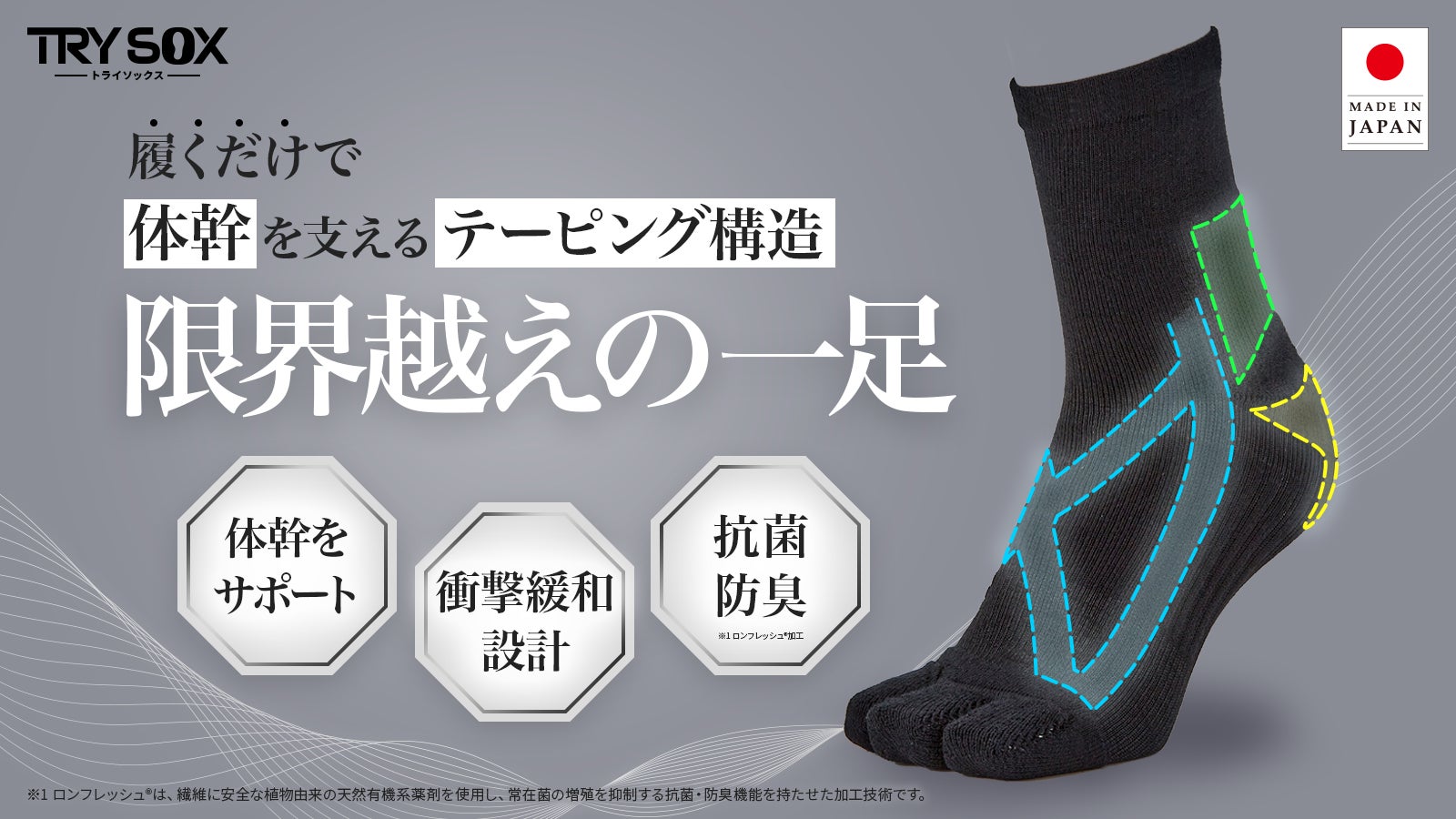 足の専門家と共同開発、[インソール×着圧×テーピング]発想の靴下で体幹をサポートする『TRYSOX』(トライソックス)を10月6日よりMakuakeにて応援購入を開始