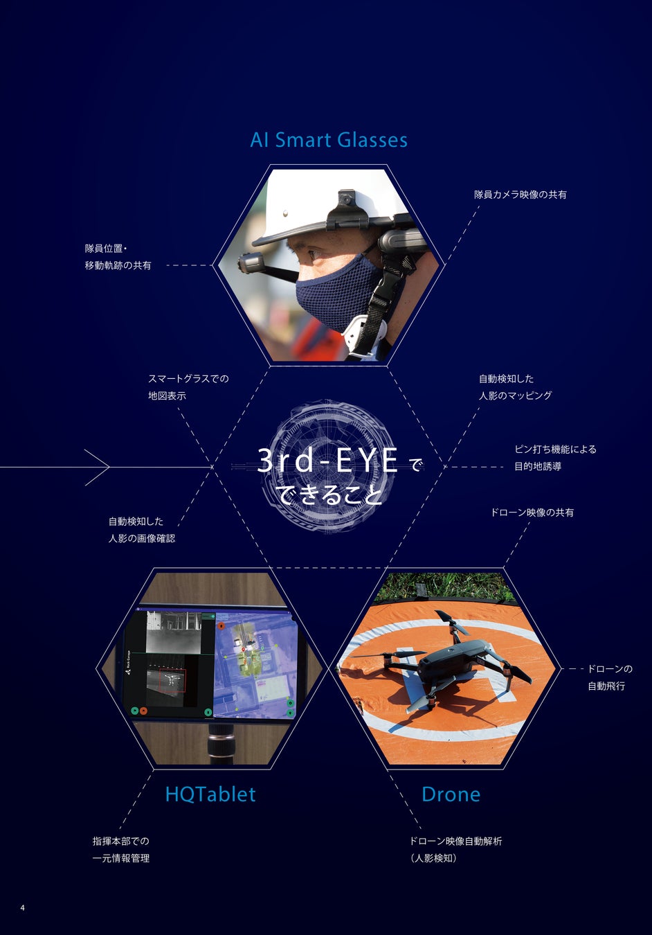 『3rd-EYE』は、ドローン、AI、スマートグラスを組み合わせた新世代の情報共有システムです。ドローンのライブ映像をAIが自動解析し、捜索対象(人)の位置を特定、現場指揮所に設置されたタブレットや隊員が装備するスマートグラスにその位置情報・映像情報を表示します。