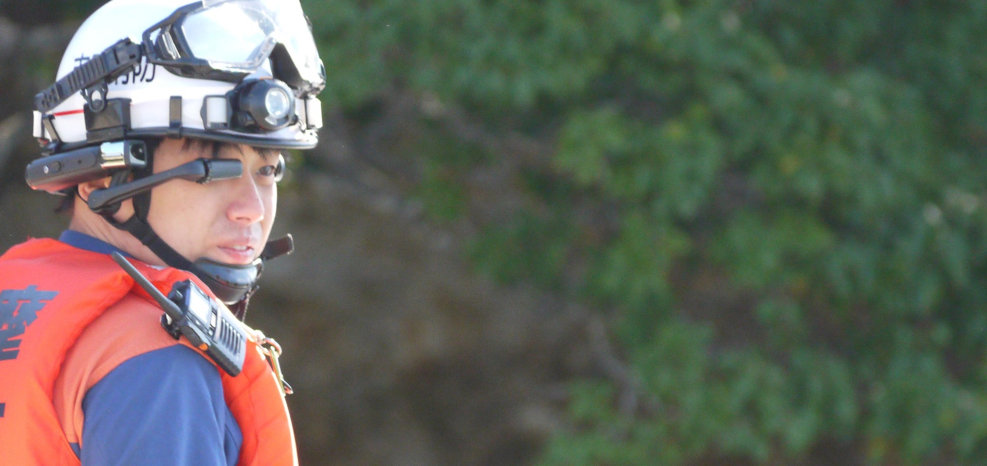 現場指揮所は、スマートグラスの位置情報機能とカメラ機能により、捜索の状況や範囲を把握し、隊員に適切な指示を送ります。