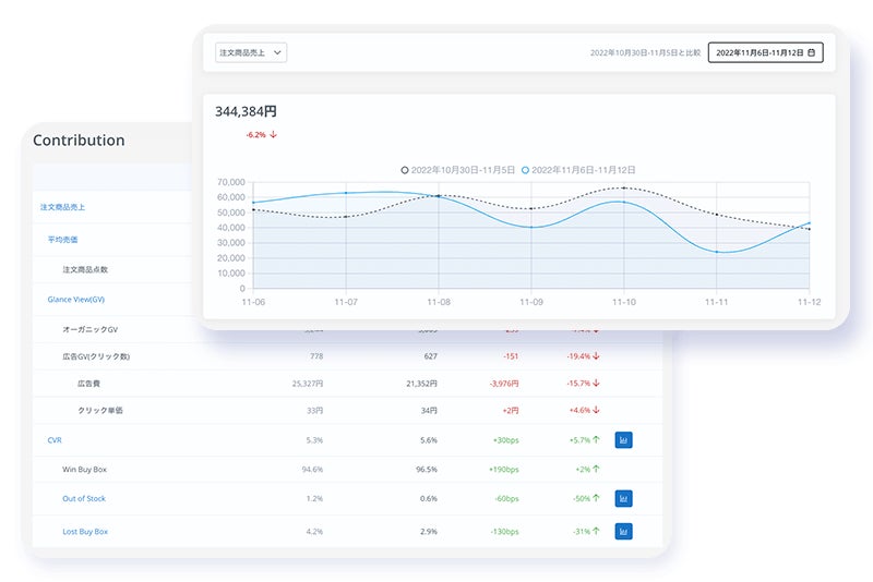 売上やGlanceViewといった各KPIにおける週次で変化の割合や、全体へのインパクトをASINレベルで特定し、KPI改善のためのアクションを促します。