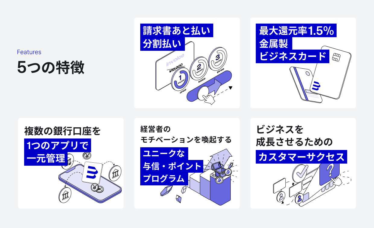 デザイン性・還率・機能性のすべてにおいてハイクオリティなビジネスカードを僅か5分で申し込む事ができます。カードとアプリが連動しているので、明細確認や利用停止などをスマホで管理することが可能。
