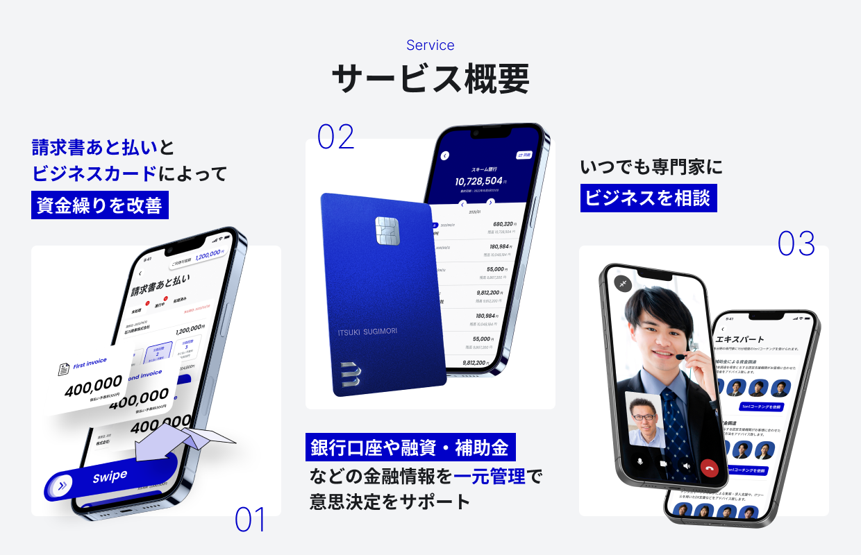 請求書あと払いとビジネスカード発行で資金繰りの改善や、融資や補助金などの提案まで。
