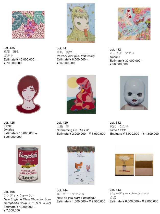 鮮やかな葡萄のモチーフが描かれた草間 彌生のアクリル作品を皮切りに、スタイリッシュなモノトーンの南瓜を含むアクリル、グアッシュ、コラージュ等のオリジナル作品が8点、エディション作品が21点と、本セールのラインナップを通して多種多様な草間ワールドが展開します。その他、ロッカク アヤコの100×100cmスクエアのキャンヴァス作品、KYNEの大型キャンヴァス作品、色鉛筆で描かれた奈良 美智のオリジナル作品等がセールに彩りを添え、今井 麗や友沢 こたおなど、近年のマーケットを賑わす新進気鋭の作家も登場します。キャンベルスープ缶を含む計5点のウォーホルによるシルクスクリーン作品をはじめ、ジョーディー・カーウィック、エドガー・プランズ等注目の海外作家も数多く揃います。