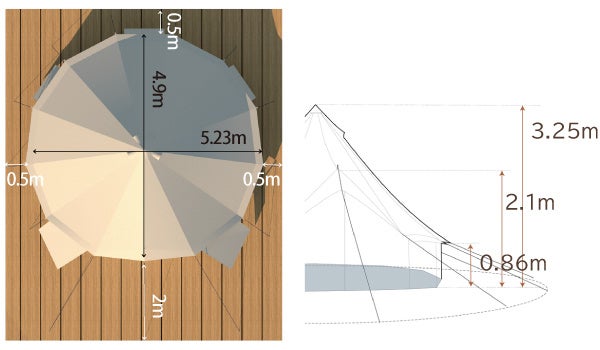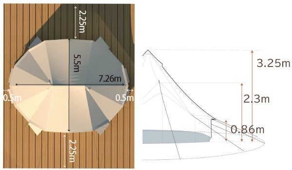入り口部分は高さ2.1m、横幅2.45mもあり、開口が広く、使い勝手が良くて開放的。直径5.2mサイズで、カップルからファミリーまで幅広く活用出来るグランピングに最適なテントです。