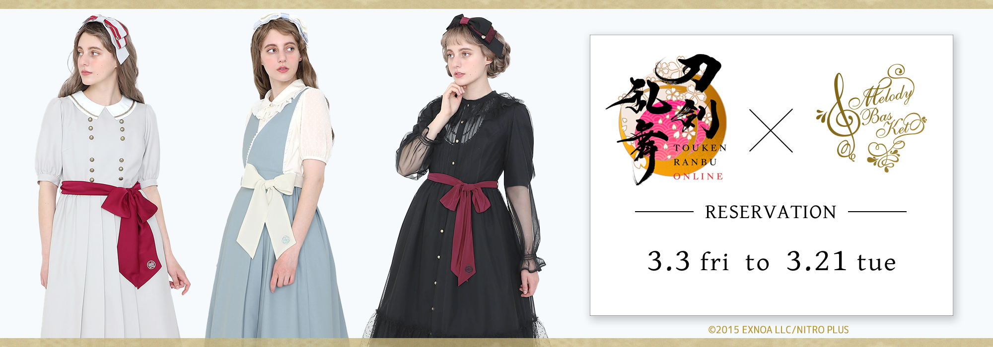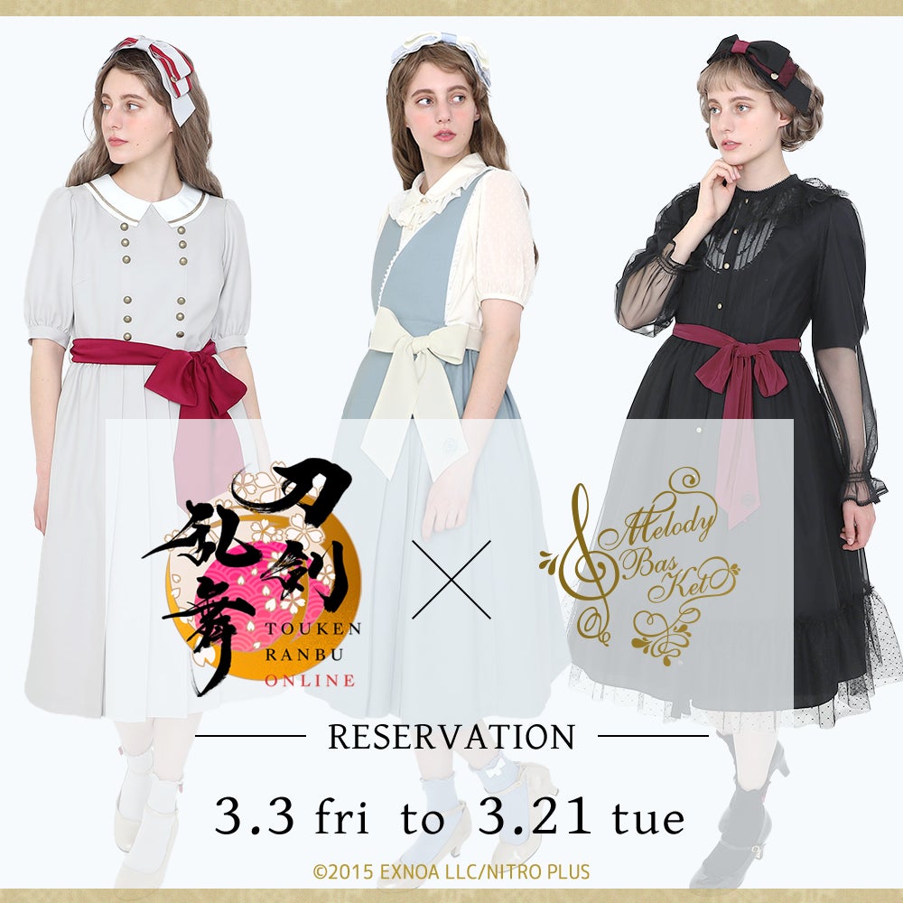 株式会社ジェイジョリー(本社:東京都渋谷区、代表取締役社長:阿部友磨)が展開するファッションブランド「Melody BasKet」は、PCブラウザ・スマホアプリゲーム「刀剣乱舞 ONLINE」に登場する刀剣男士3振りをイメージした5アイテムを3月3日(金)よりオンラインショップ並びにセレクトショップにて受注受付を開始します。