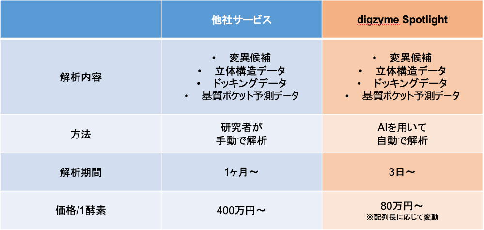 ・予測した高活性変異体の変異点は、必ずしも活性中心ではないことが多いため、人知の及ばない変異体の提案が可能。そのため、例えば他社特許の回避や牽制にも有効。