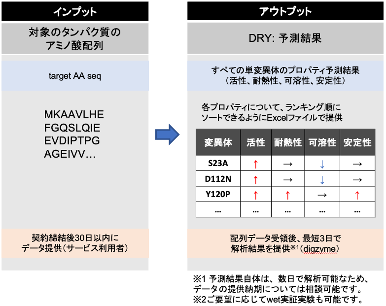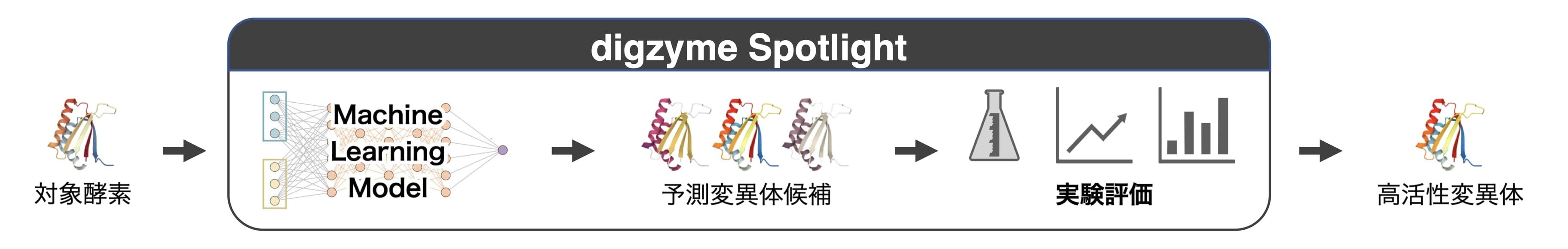 「digzyme Spotlight」は、対象酵素のアミノ酸配列をインプットとして、機械学習モデルを用いて変異体の各種プロパティ(活性、耐熱性、可溶性、安定性)を予測する酵素機能改良サービスです。予測された変異体候補の中から実験評価し、最終的に狙いの機能が改良した酵素が得られるという流れになります。本サービスの対象としては、発酵生産用に限定しています。