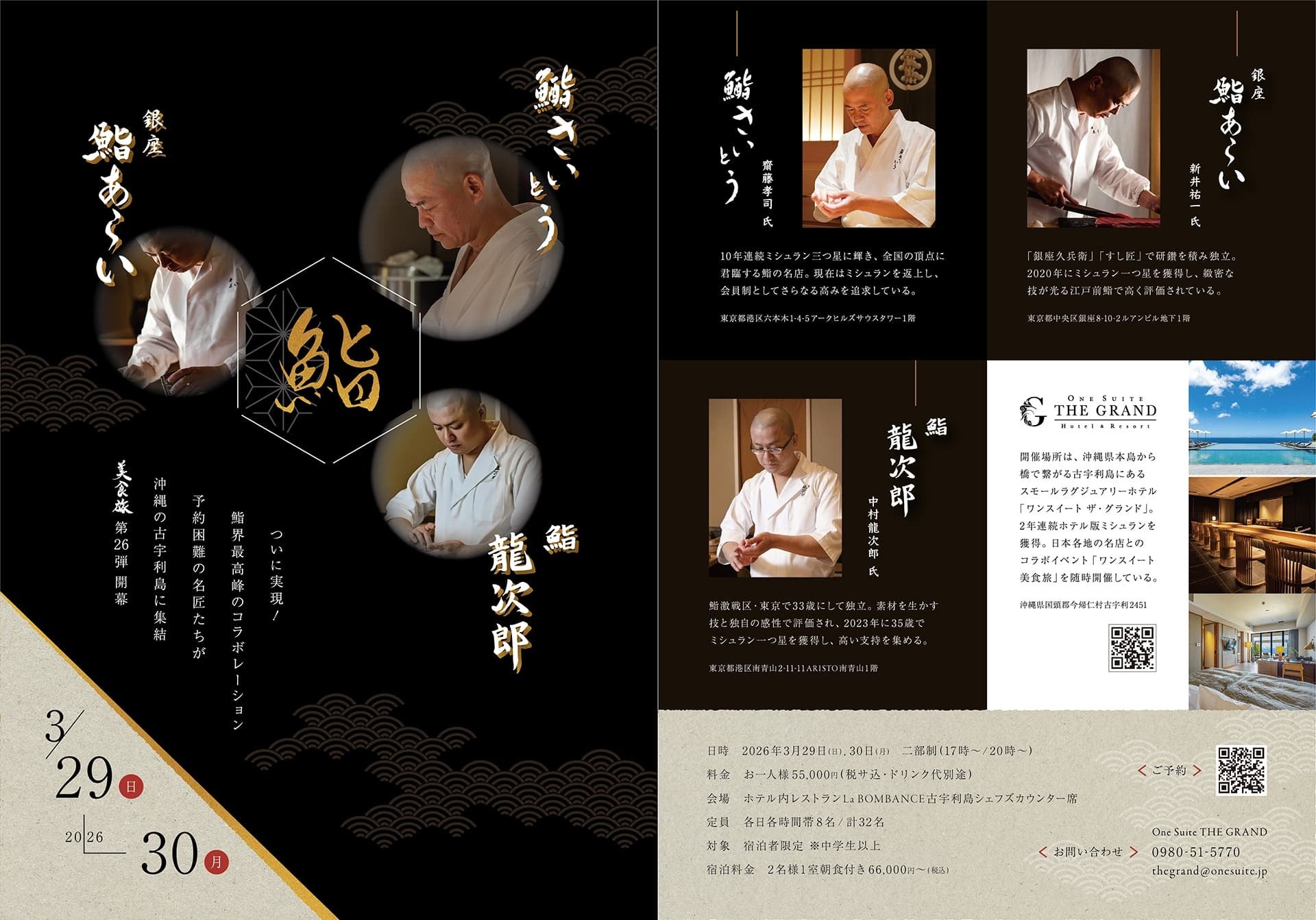 合同会社One Suite(本社:沖縄県今帰仁村/代表社員:貝塚志朗)が沖縄本島北部にある古宇利島にて運営するホテル「One Suite THE GRAND(ワンスイート ザ・グランド:今帰仁村古宇利)」は、去る2026年3月29日(日)・30日(月)の2日間、施設内レストラン「La BOMBANCE古宇利島」にて”ワンスイート美食旅 第26弾”と題して、六本木「鮨 さいとう」、銀座「鮨 あらい」、南青山「鮨 龍次郎」の3店舗合同のコラボディナーイベントを開催いたしました。