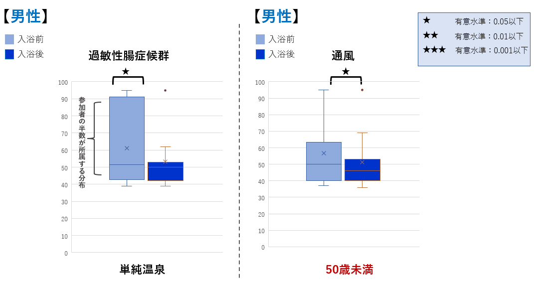 入浴前後で疾病リスクが減少した疾病は泉質別・男女別で下表の結果となりました(表2)。この一覧から分かるように、泉質別・男女別で異なる疾病リスクの減少が見受けられます。疾病リスクの変化に統計的な有意な結果が出たものとしては、単純温泉に男性が入浴すると「過敏性腸症候群」の疾病リスクが有意に減少することが判明しました(図1左)。また男性の50歳未満では5つの泉質の温泉のどれかに入浴することで「通風」の疾病リスクが有意に減少することが判明しました(図1右)。