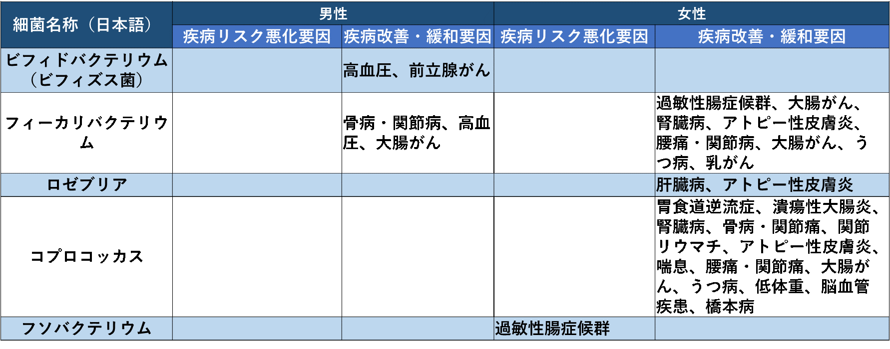 疾病リスクの数値の予測に腸内細菌叢の占有率を用いています。この腸内細菌叢の各細菌の占有率の変化が疾病リスク増減の要因となるものであるため、この腸内細菌叢に関しても分析を行いました。腸内細菌叢における各種細菌は人によって腸内における出現率と占有率が大きく異なるため、今回は各参加者の腸内で上位20件の占有率を持つ腸内細菌を対象に分析を行いました。そしてその中から様々な疾病との相関が報告されている腸内細菌に着目して分析を行いました。下記一覧は着目した腸内細菌が疾病とどのように関連するかをまとめた表となります(表3)。「疾病リスク悪化要因」の列に疾病の記載がある場合、その腸内細菌が増加することによって、疾病リスクが増加すると言われています。一方で、「疾病改善・緩和要因」の列に疾病の記載がある場合、その腸内細菌が増加することで、疾病リスクの減少が見込まれます。
