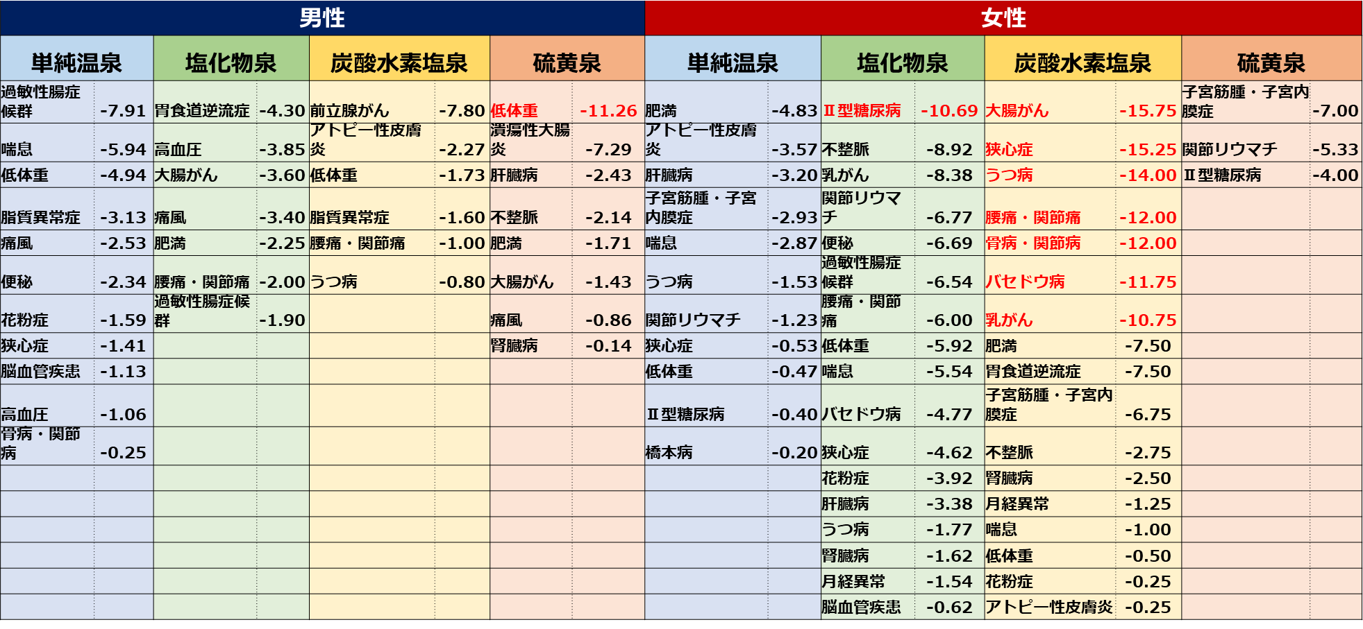 表2. 泉質別男女別で疾病リスクが下がった疾病