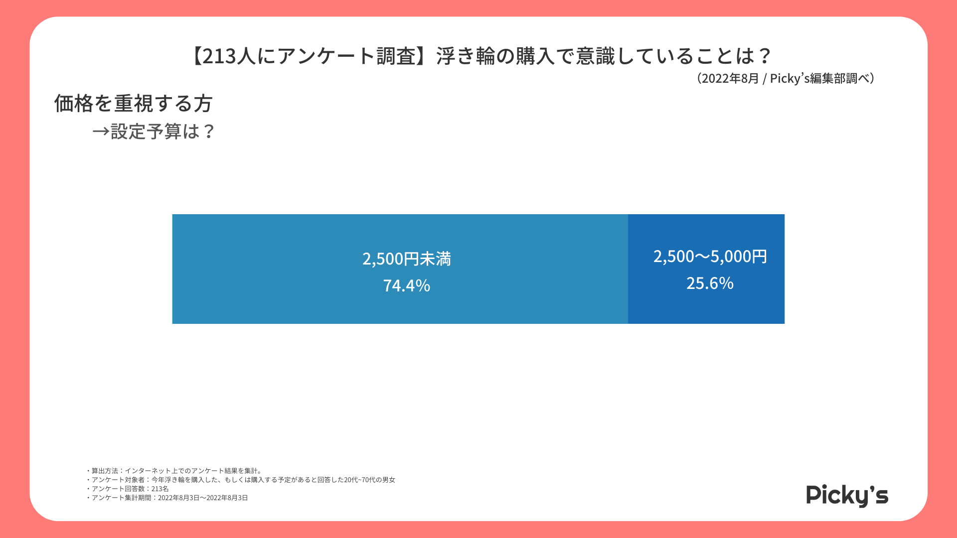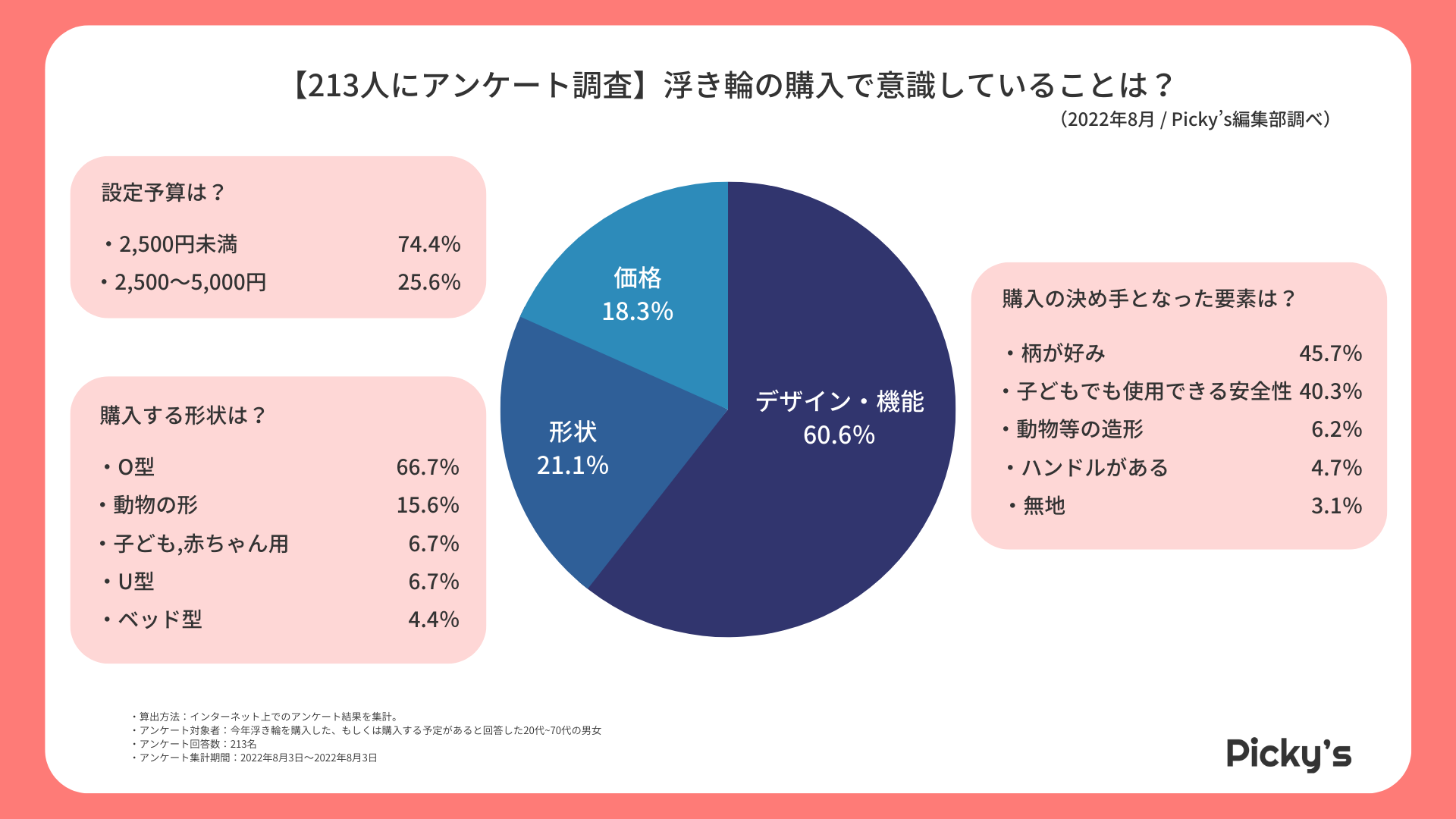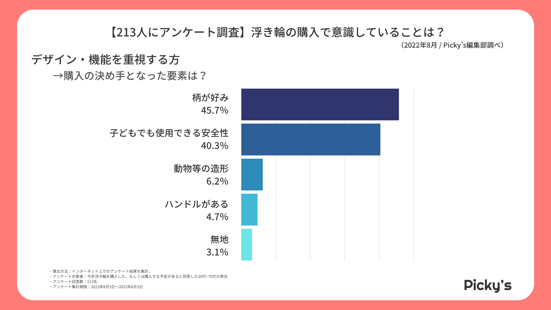 デザインや機能を重視すると回答した人の約半分が浮き輪のデザインが好みで購入したと回答していました。