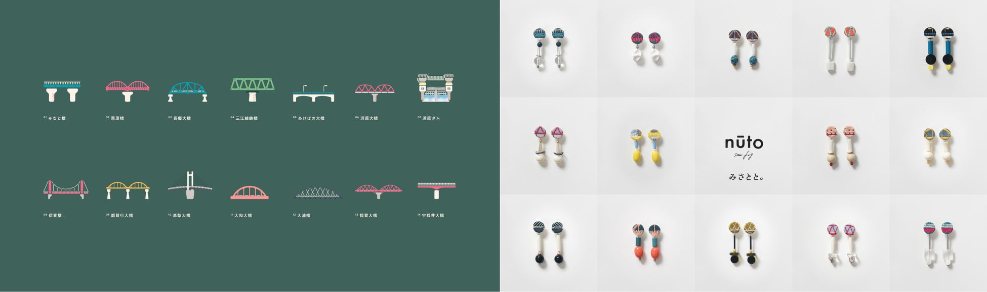 刺繍クリエイターnūto saw figさんと『みさとと。』のコラボレーション商品。手刺繍とヴィンテージビーズにこだわった世界にひとつの一点物アクセサリーです。美郷町にかかる14の橋がモチーフになっています。