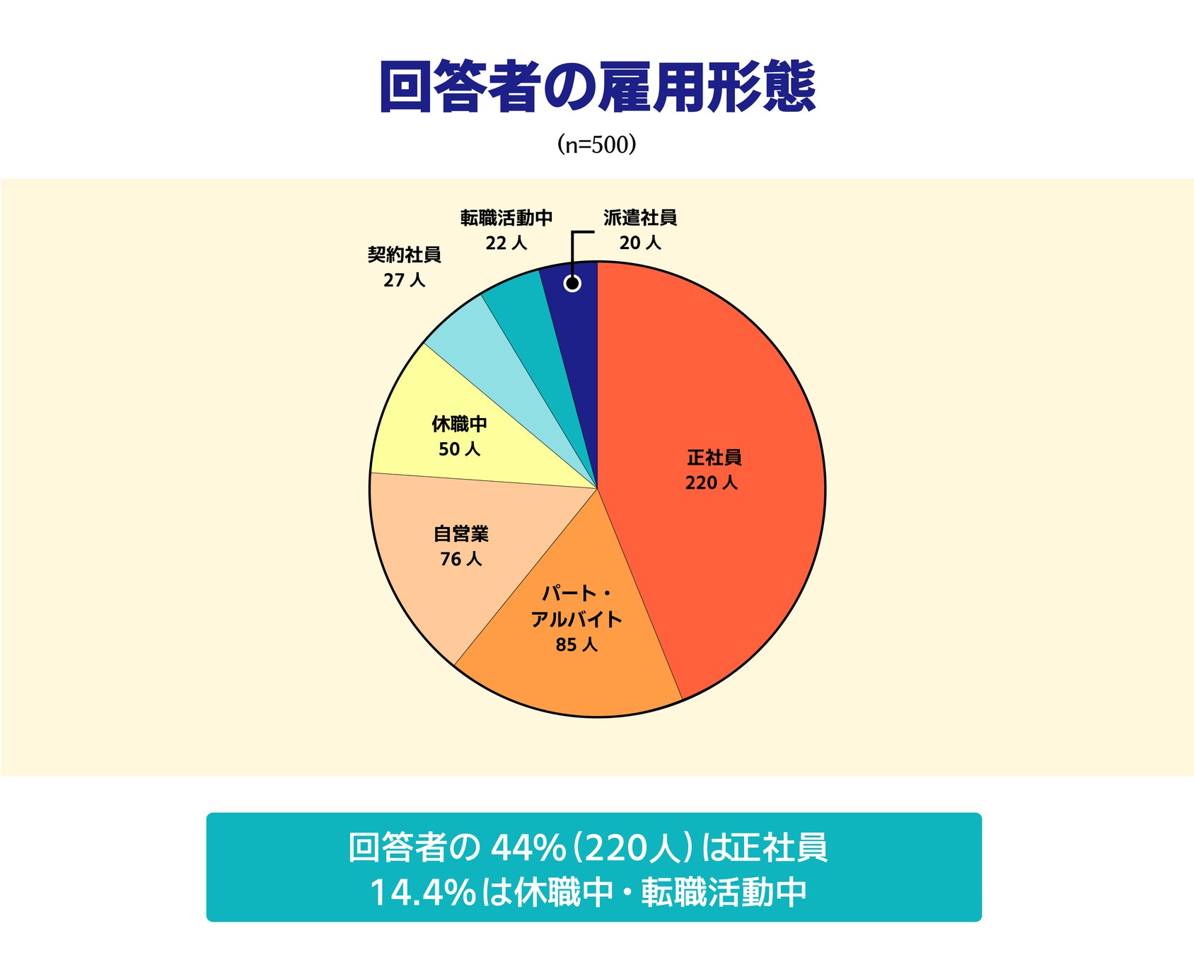 現在の雇用形態について質問したところ、44%(220人)の回答者は正社員、次点でパート・アルバイトが多く17%(85人)でした。
