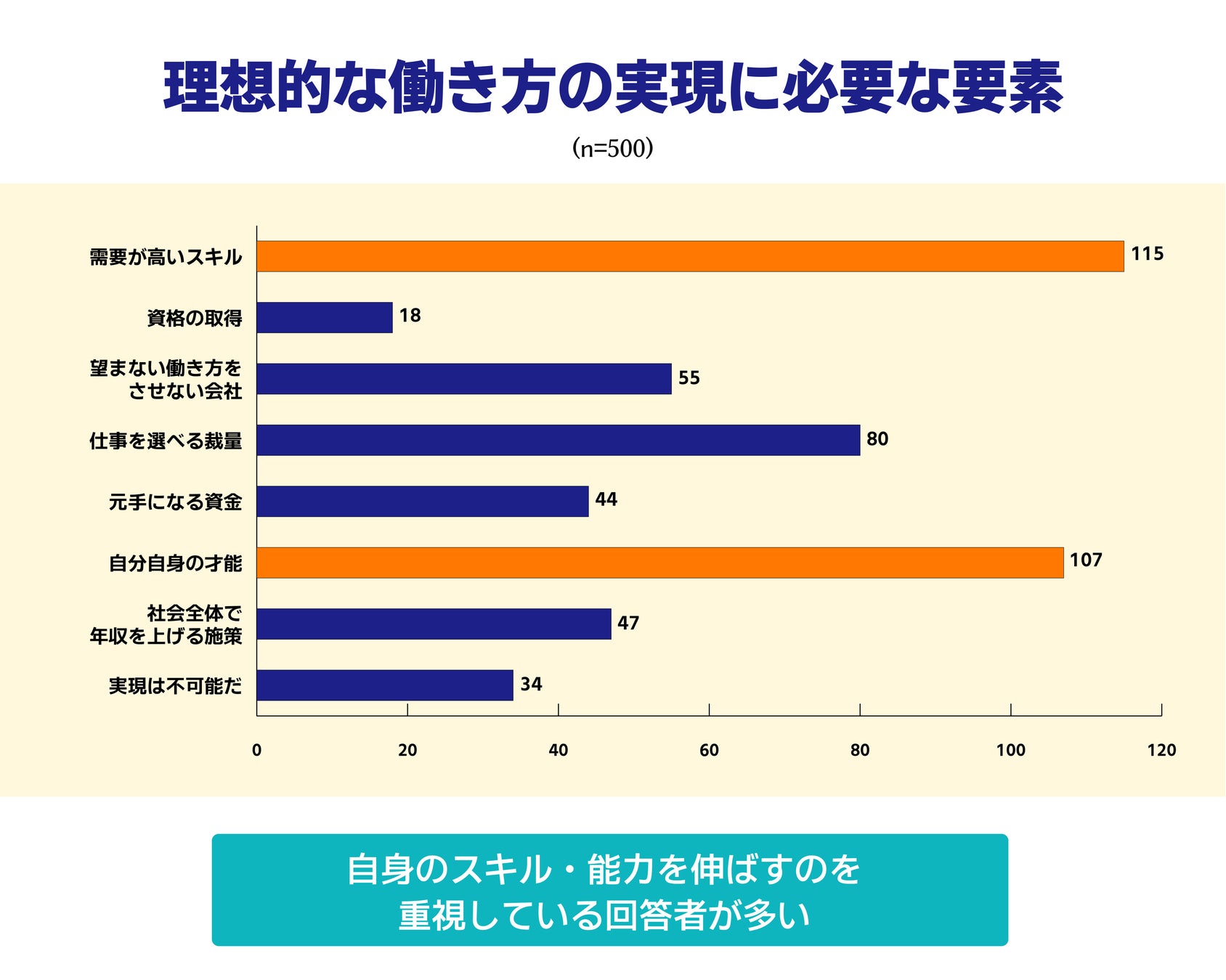特に回答が多かったのは「需要が高いスキル」23% (115人)、「自分自身の才能」21.4% (107人)でした。