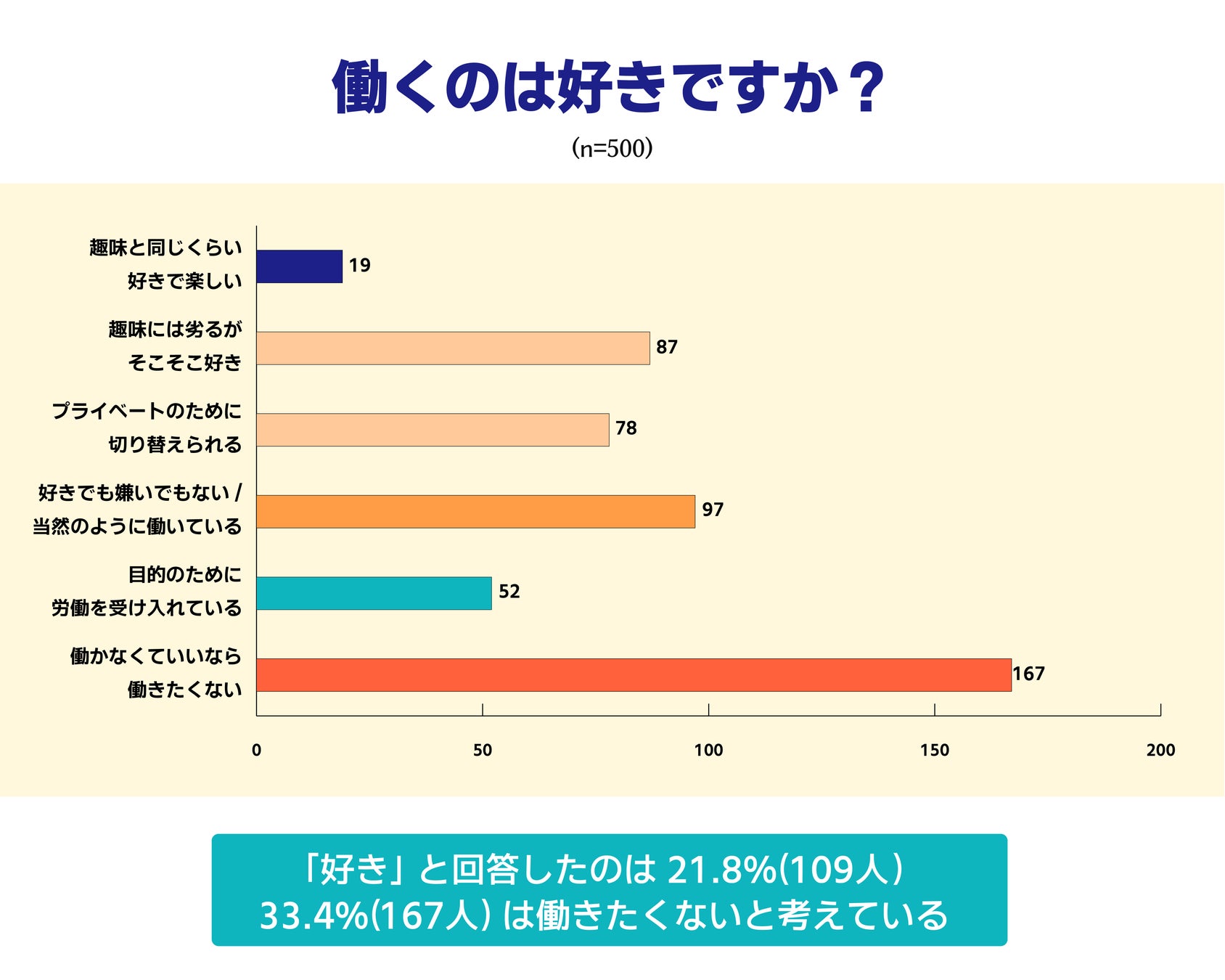 働くのが好きではない、とする回答に対して、「趣味と同じくらい好きで楽しい」「趣味には劣るがそこそこ好き」と回答した層は合計で21.8%(109人)でした。