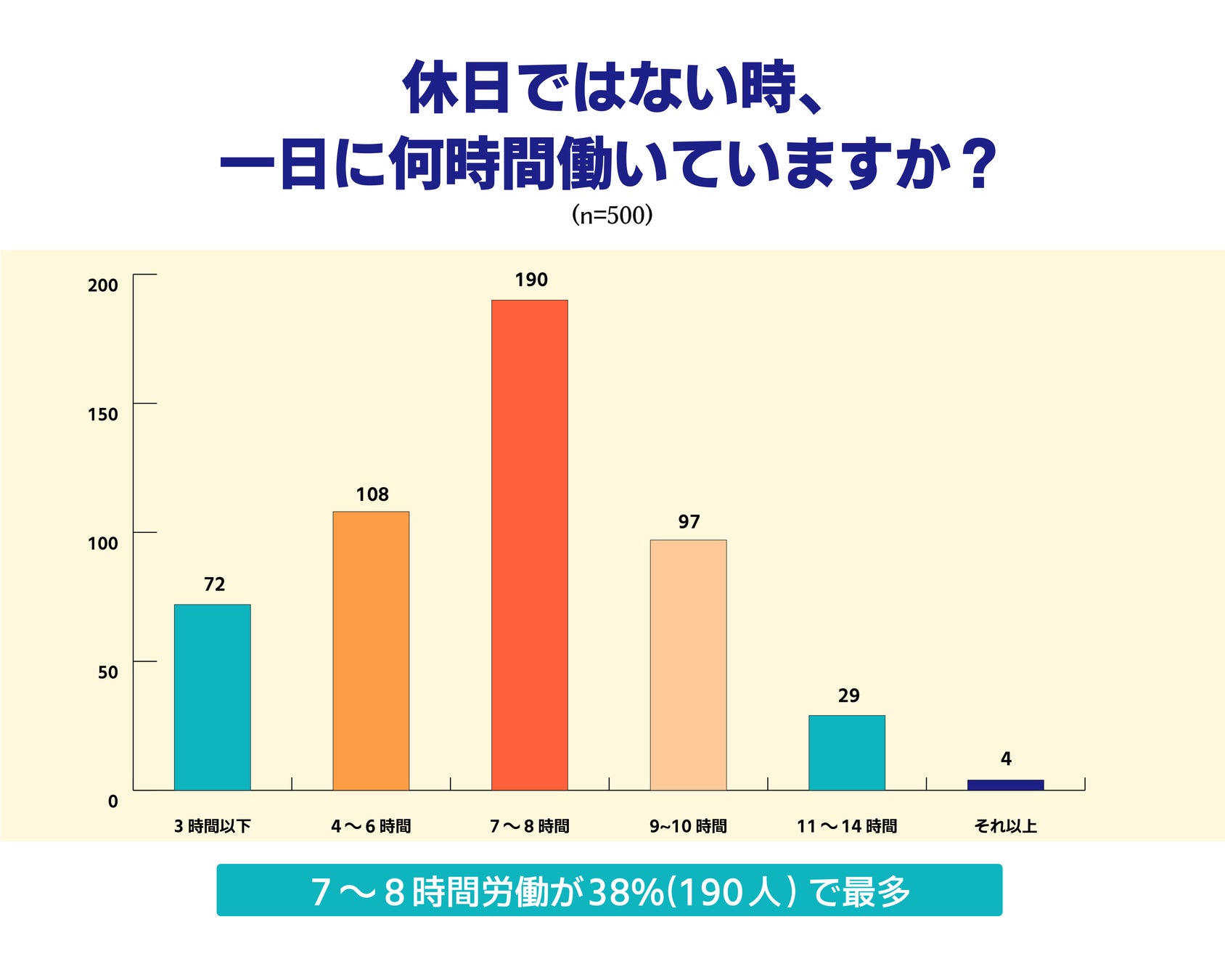 法定労働時間のラインとなる8時間近く働いている労働者は、全体の38%(190人)でした。