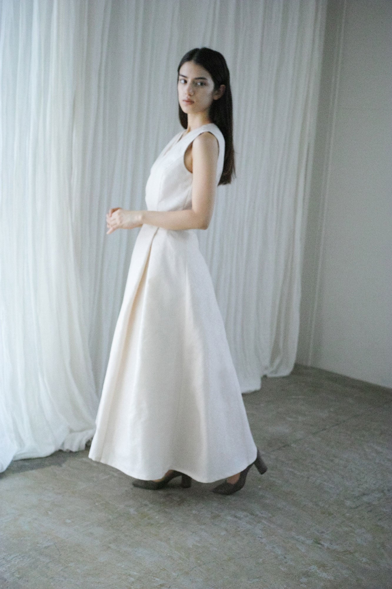 西陣織の定義とは「西陣地区で生産される先染の紋織物※1」、つまり素材ではなく技術を指します。このドレスでは西陣織をポリエステルで織っているため、水や摩擦に強く、絹の西陣織より扱いやすい生地となっています。絹に劣らない柔らかい質感、上品な光沢感を楽しんでいただける現代に生きる西陣織を楽しんでいただけます。