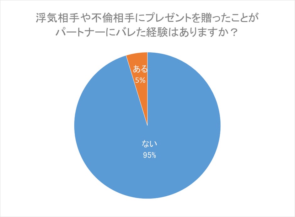 「浮気相手や不倫相手にプレゼントを贈ったことがパートナーにバレた経験はありますか?」という質問に対しては、95%の人が「ない」と回答し、「ある」と回答した人はわずか5%にとどまりました。