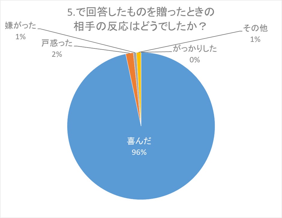 「喜んだ」と回答した人が96%、「戸惑った」が2%、「その他」「嫌がった」が1%で、贈り手の苦労が報われる結果となりました。