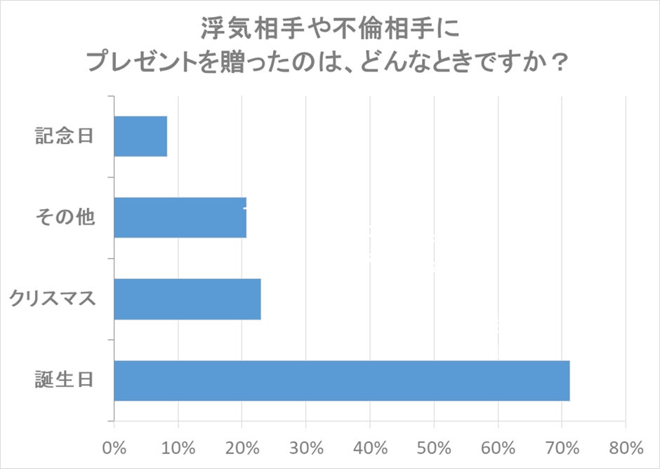 「浮気相手や不倫相手にプレゼントを贈ったのは、どんなときですか?という質問に対して、全体の71%の人が「誕生日」、23%が「クリスマス」と回答し、「その他」21%、「記念日」8%が続く結果となりました。