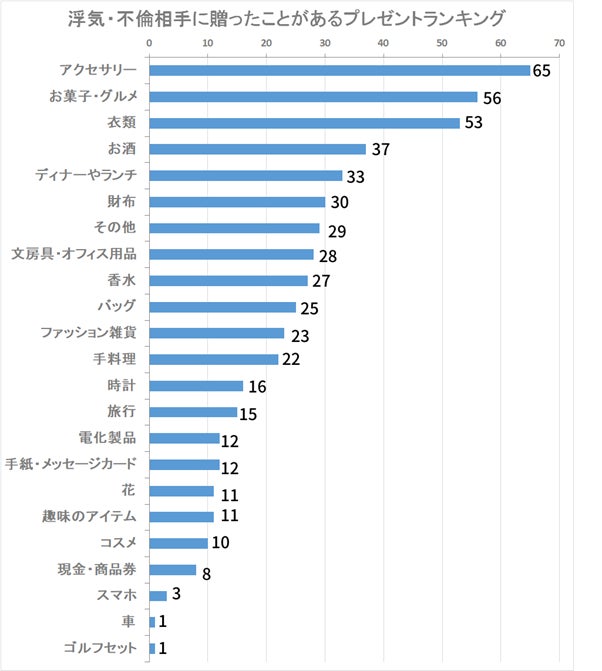 「今まで浮気相手や不倫相手にプレゼントしたことがあるものを教えてください」という質問に対して、1位は65票の「アクセサリー」、2位は56票の「お菓子・グルメ」、3位は53票の「衣類」、そして「お酒」37票、「ディナーやランチ」33票と続く結果になりました。