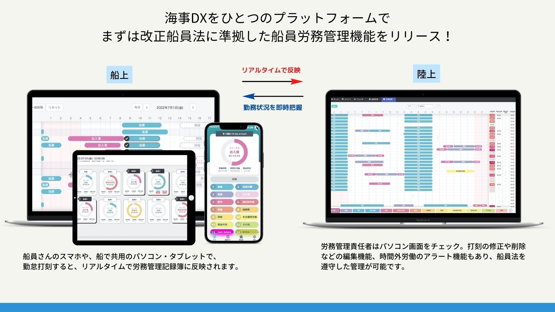 海事産業における船員不足、規則の煩雑化による業務過多など、あらゆる問題をデジタルテクノロジーのチカラで解決するために立ち上げたクラウドサービスです。まずは、2022年4月に改定された船員法を網羅した労務管理記録簿を自動で作成する船員労務管理機能を2022年6月にリリースしました。お陰様で導入企業様は増え、お客様のフィードバックを受けながらサービスの拡充を続けています。