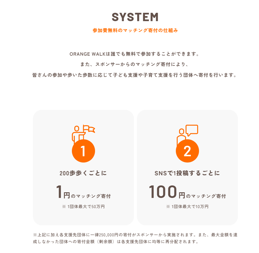 児童虐待のない社会の実現を願って。あなたの一歩が寄付になる。 ORANGE WALKは「児童虐待のない社会のために私たちは歩く」のコンセプトのもと、11月の 児童虐待防止月間中、歩くことで児童虐待防止に取り組む団体へ寄付を届ける企画です。 通学や通勤、買い物、散歩、、。 日々の「歩く」時間が、支援を届ける時間に変わります。 特設サイトからエントリーすれば、簡単に、無料で、誰でもどこからでも参加可能です。 イベント期間中のエントリー人数と、スマートフォンの歩数計測アプリ「minpo」で計測さ れる参加者の累計計測歩数に応じて、スポンサーからマッチング寄付が届けられます。