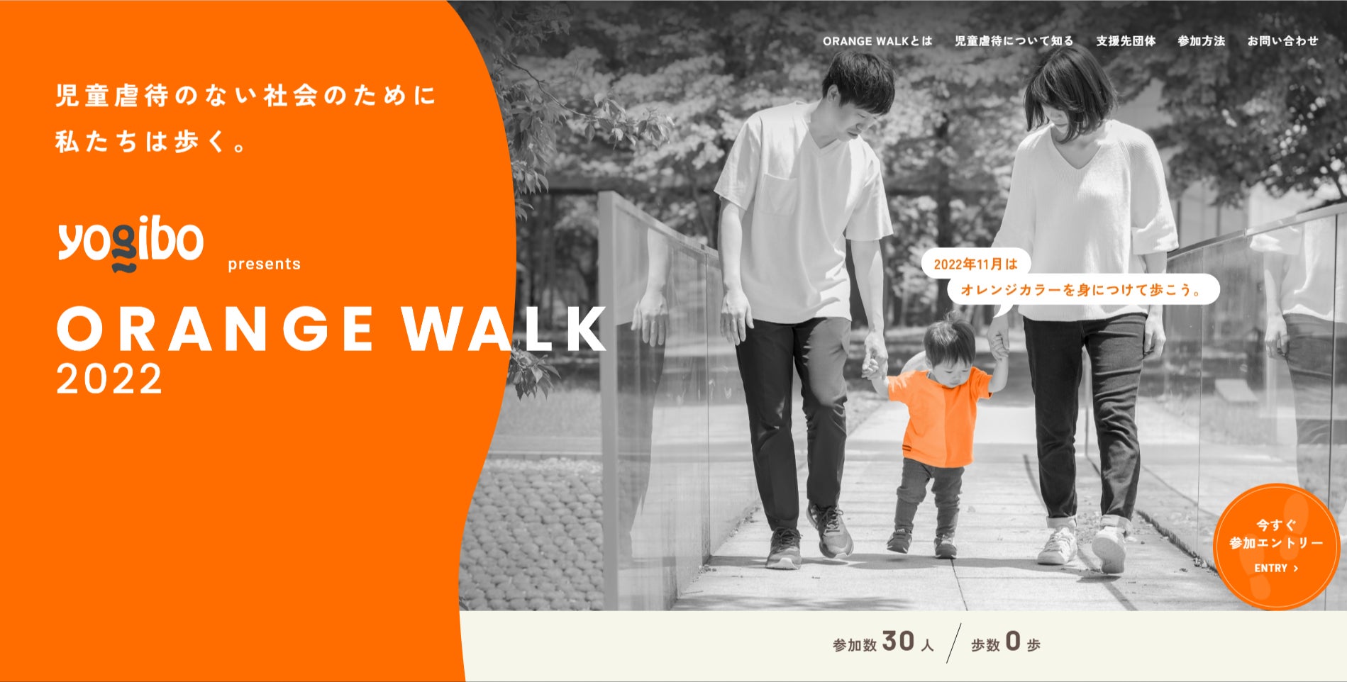 NPO法人日本こども支援協会は、コングラント株式会社との共催にて、オンライン参加型チ ャリティウォーク企画「Yogibo presents ORANGE WALK 2022(以下ORANGE WALK)」を実施 します。