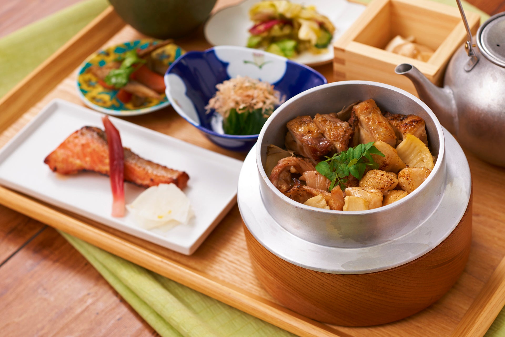 大山鶏の旨味が浸み込んだ羽釜ごはんと漬け魚、おばん菜などが付いた御膳。最後は出汁茶漬けが楽しめます。