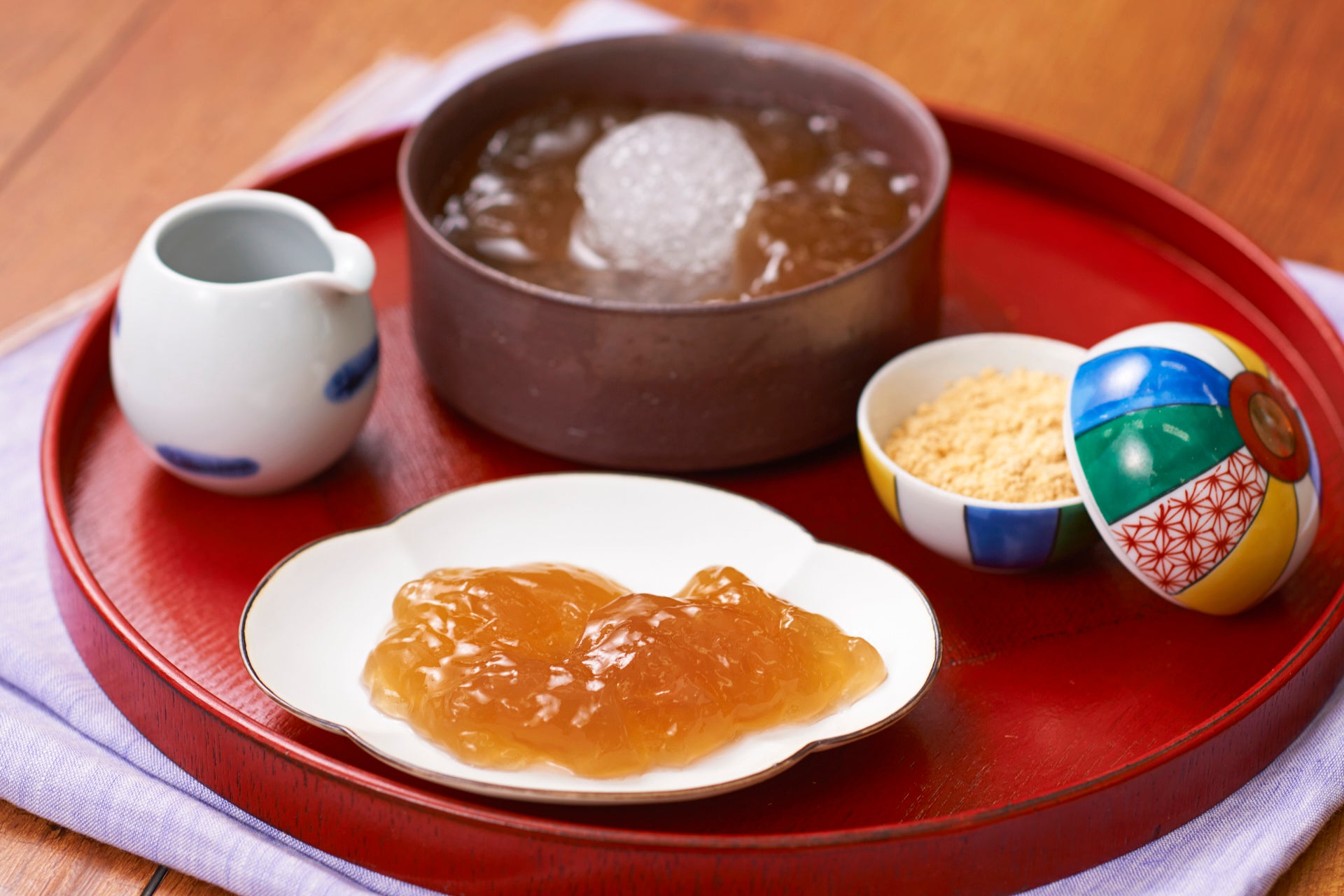 店舗で丁寧に練り上げたわらび餅にお好みできな粉と黒蜜をかけてお召し上がりいただきます。