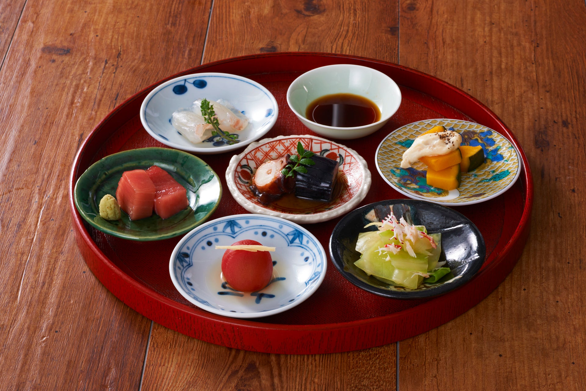 お出汁に漬け込んだ「お出汁トマト」、「エリンギの明太おろし和え」、「かぼちゃのマスカルポーネ味噌」、有馬山椒香る「蛸と茄子の有馬煮」など季節の食材を使ったおばん菜は9種類以上ご用意しています。
