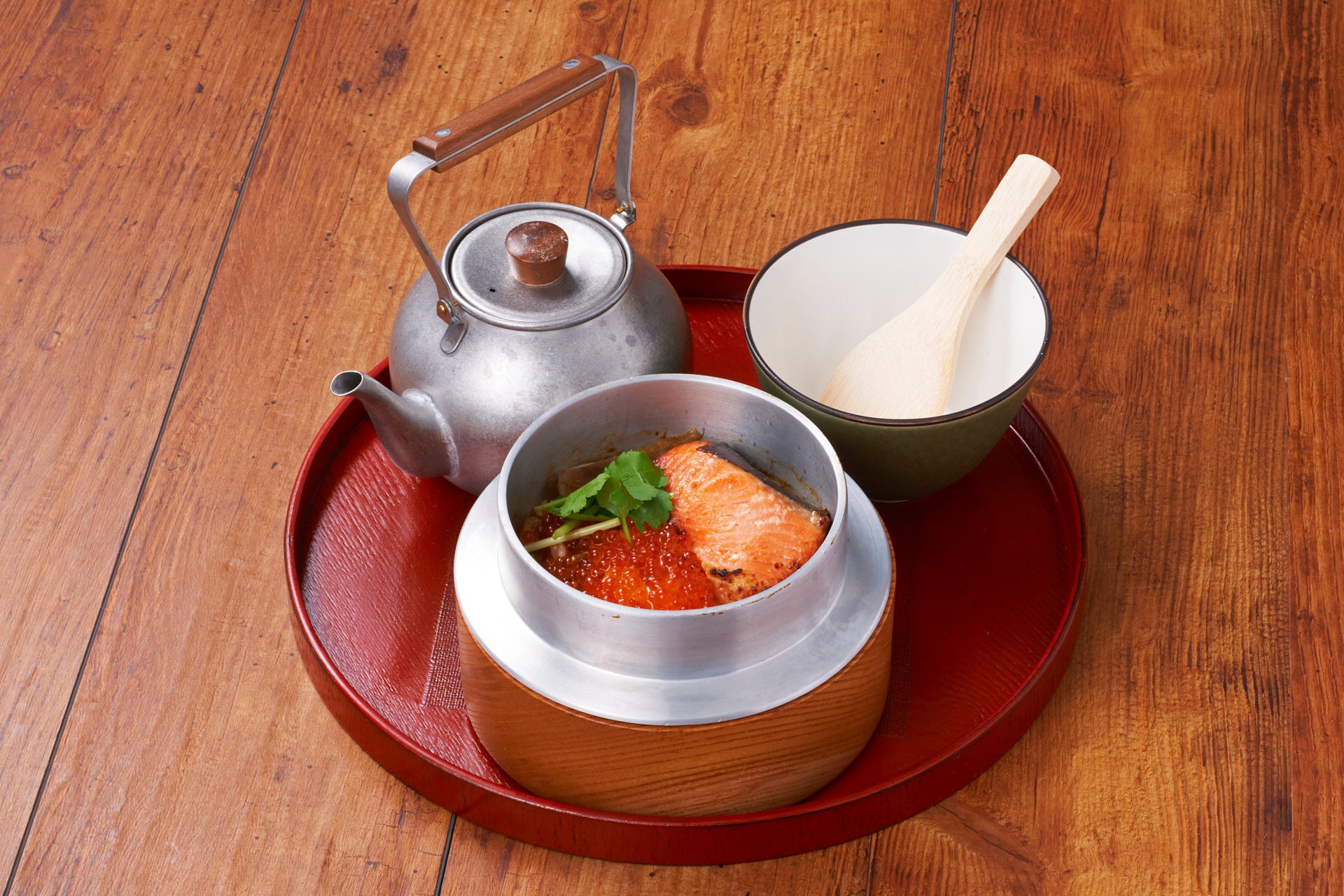 お出汁でふっくら炊き上げた羽釜ごはんに、脂ののった銀鮭といくらを合わせました。まずはそのまま、次にお出汁をかけて出汁茶漬けでどうぞ!
