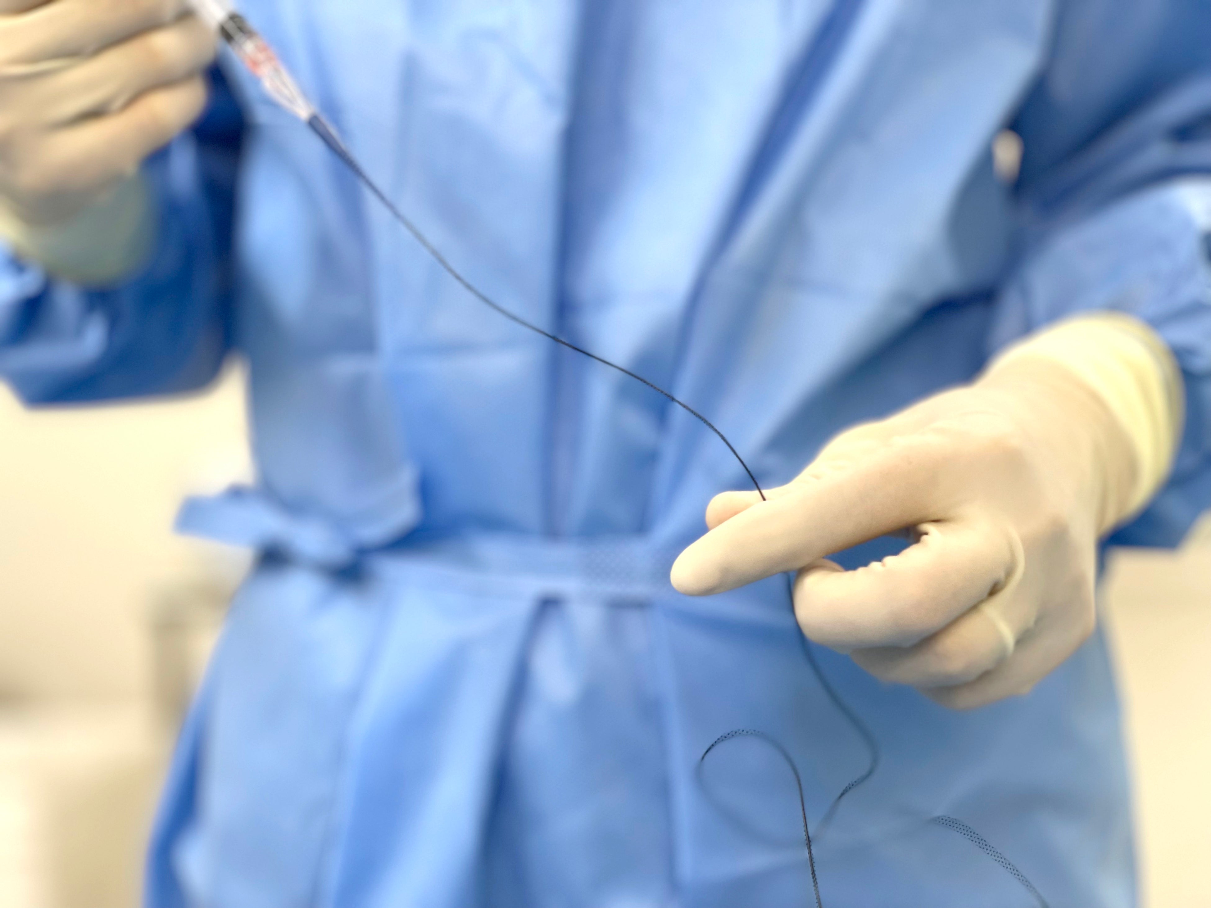 当院で実施する痔のカテーテル治療は、細いカテーテル(チューブ)を太ももの付け根である鼠径部から動脈内部に挿入。そのため、手術を受けている患者さんは痛みを感じることもなく、手術時に患部を切ることもないため、肛門括約筋の機能を損なう心配もありません。鼠径部から内痔核の近くまでチューブを入れていき、チューブの先端から血液の流れを遅くするデバイス(医療機器)を用いて、内痔核への異常な血液の流れを部分的に遮断します。
