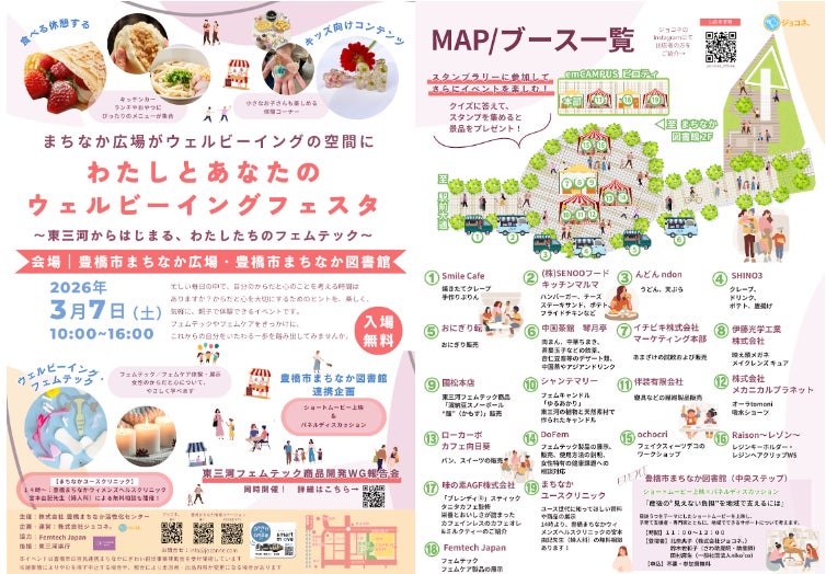 本イベントは、豊橋市まちなか広場を中心に、豊橋市まちなか図書館や豊橋まちなかウィメンズヘルスクリニックと連携し、まちなか全体を舞台に展開するウェルビーイング企画です。