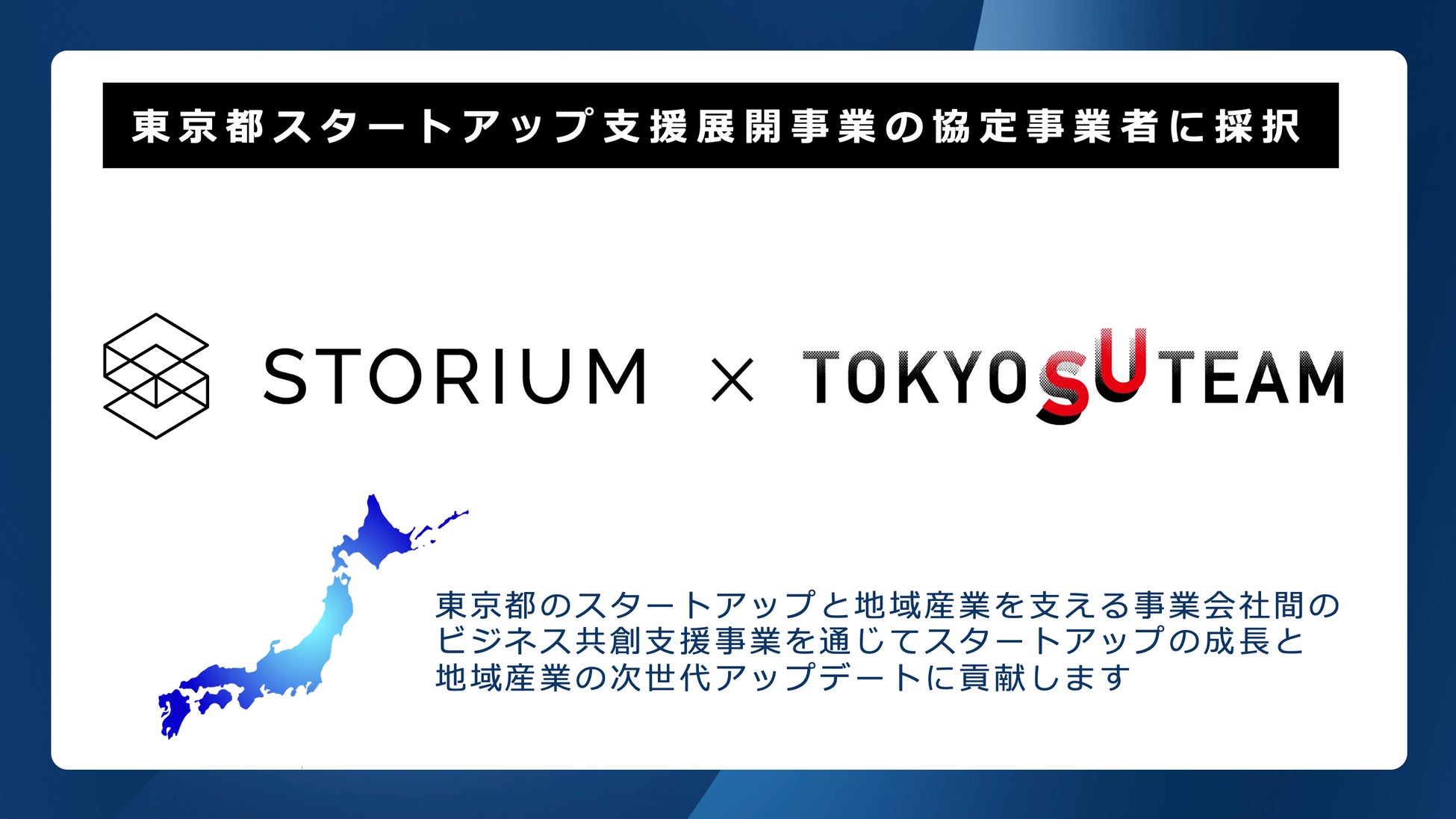 また本事業は、東京都のスタートアップ支援プロジェクト『TOKYO SUTEAM』との協定に基づき、東京に拠点を持つ『STORIUM』登録スタートアップに原則として無償(※)で支援を提供いたします。STORIUMと東京都は本協定事業を通じ、首都圏のスタートアップの成長を支援するとともに、地域産業の活性化と次世代化に貢献してまいります。