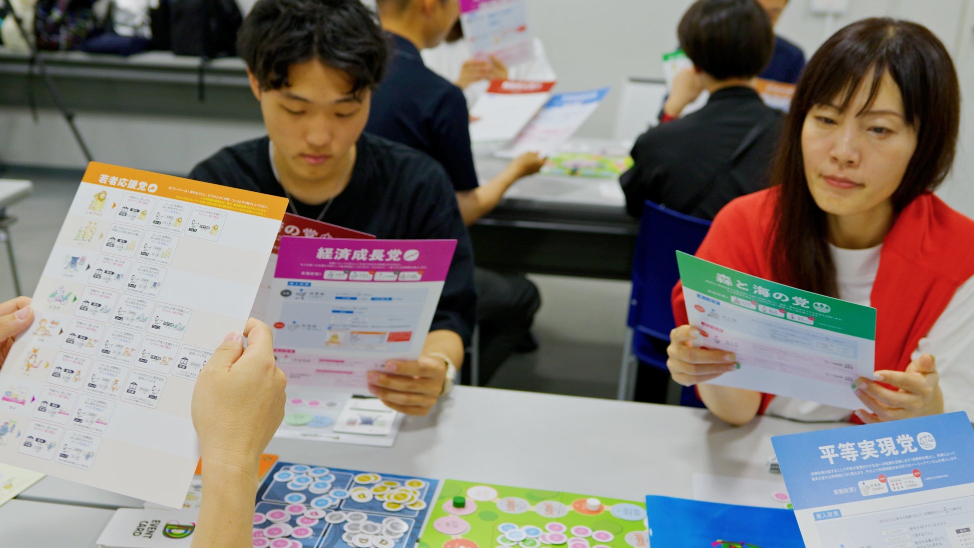 選挙では、5つの政党が掲げるマニフェストを読み込み、自身の立場や目指したい社会像に応じて投票を行います。その結果が、後半の社会のあり方に反映されていきます。