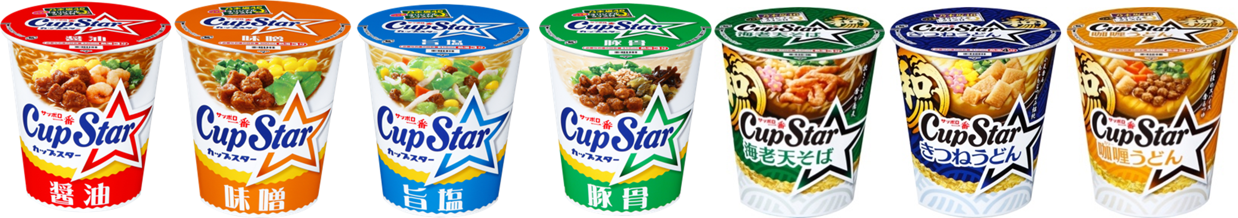 現在、醤油・味噌・旨塩・豚骨・海老天そば・きつねうどん・カリーうどんと7つのバリエーションを展開しています。