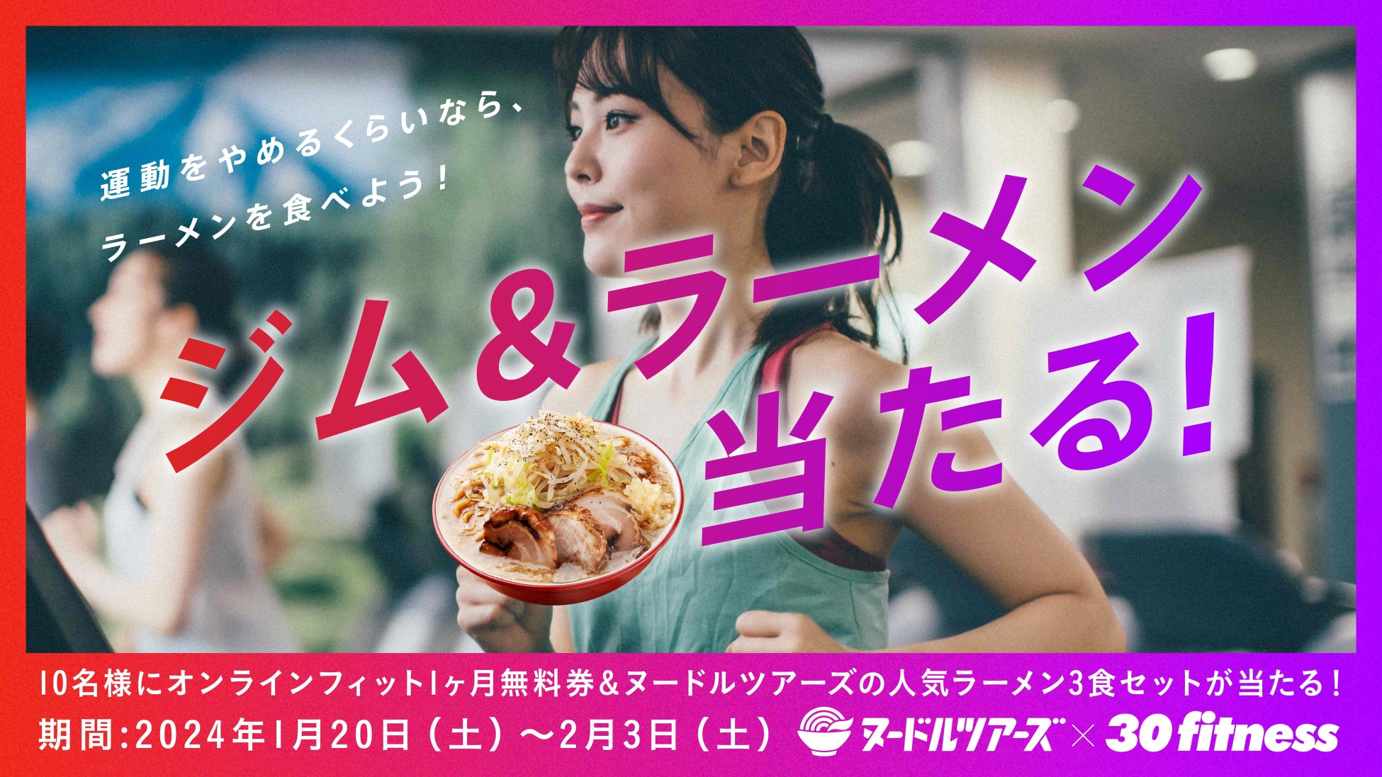 オンラインフィットネスを提供する株式会社サーティフィット(本社:東京都品川区、以下「当社」)は、株式会社丸山製麺(本社:東京都大田区)が展開する冷凍ラーメンブランド「ヌードルツアーズ」 と共同で、全国の人気有名ラーメン(冷凍)と当社のオンラインフィットネス1ヶ月無料券が当たるキャンペーンを2024年1月20日(土)より開催いたします。