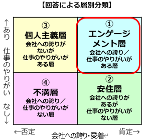 JMARでは、「会社への誇り・愛着」と「仕事のやりがい」の回答を組み合わせて4つの層に分け、「会社への誇り・愛着」と「仕事のやりがい」の両方が高い層を「エンゲージメント層」と定義しました。