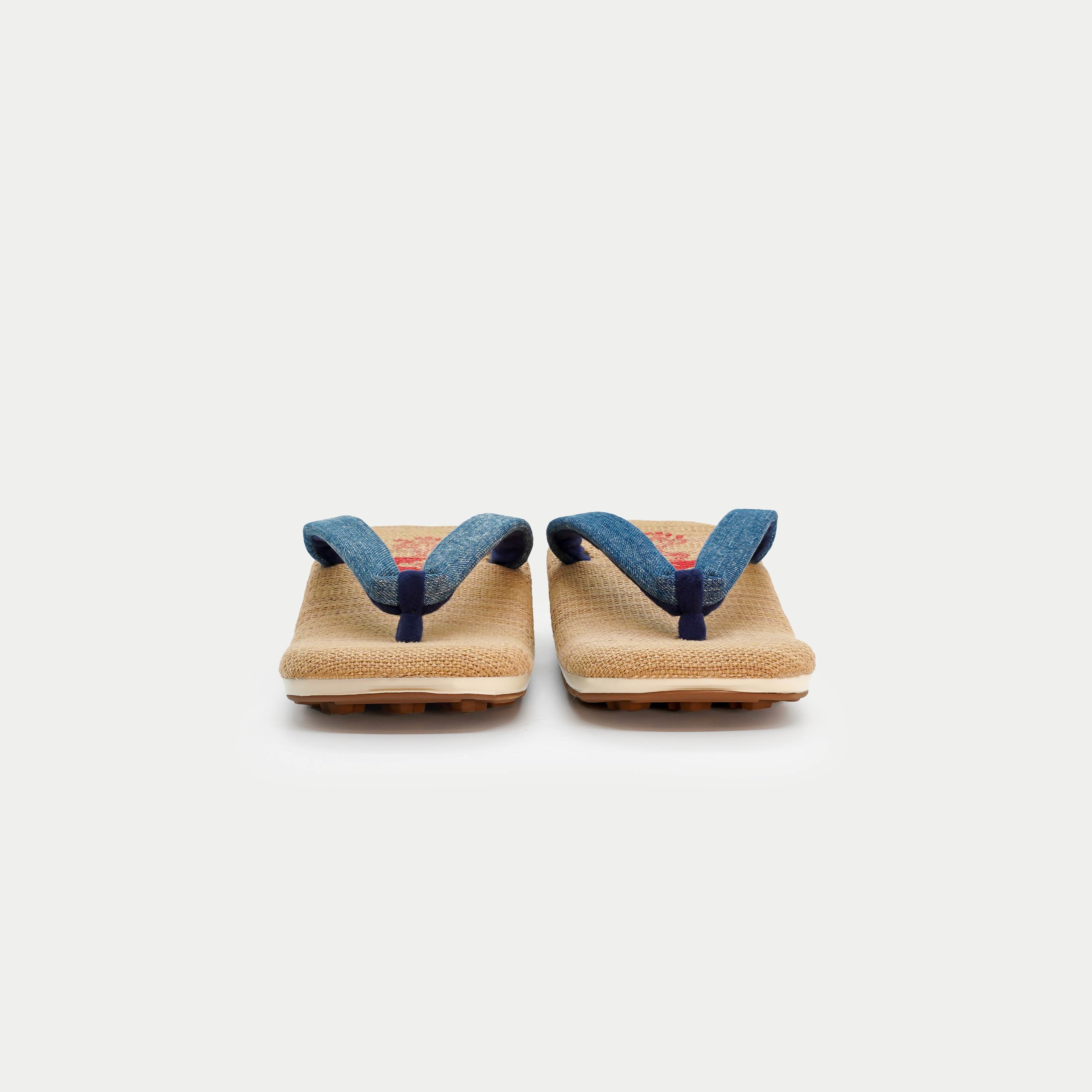 天板と鼻緒には耐久性の高いポリエステルオックス生地を採用。鼻緒には、「デンハム ザ ジーンメーカー」「ナカメマン」の文字がプリントされ、フットベッド踵部分にはシザーマークの刺繍が施されている。