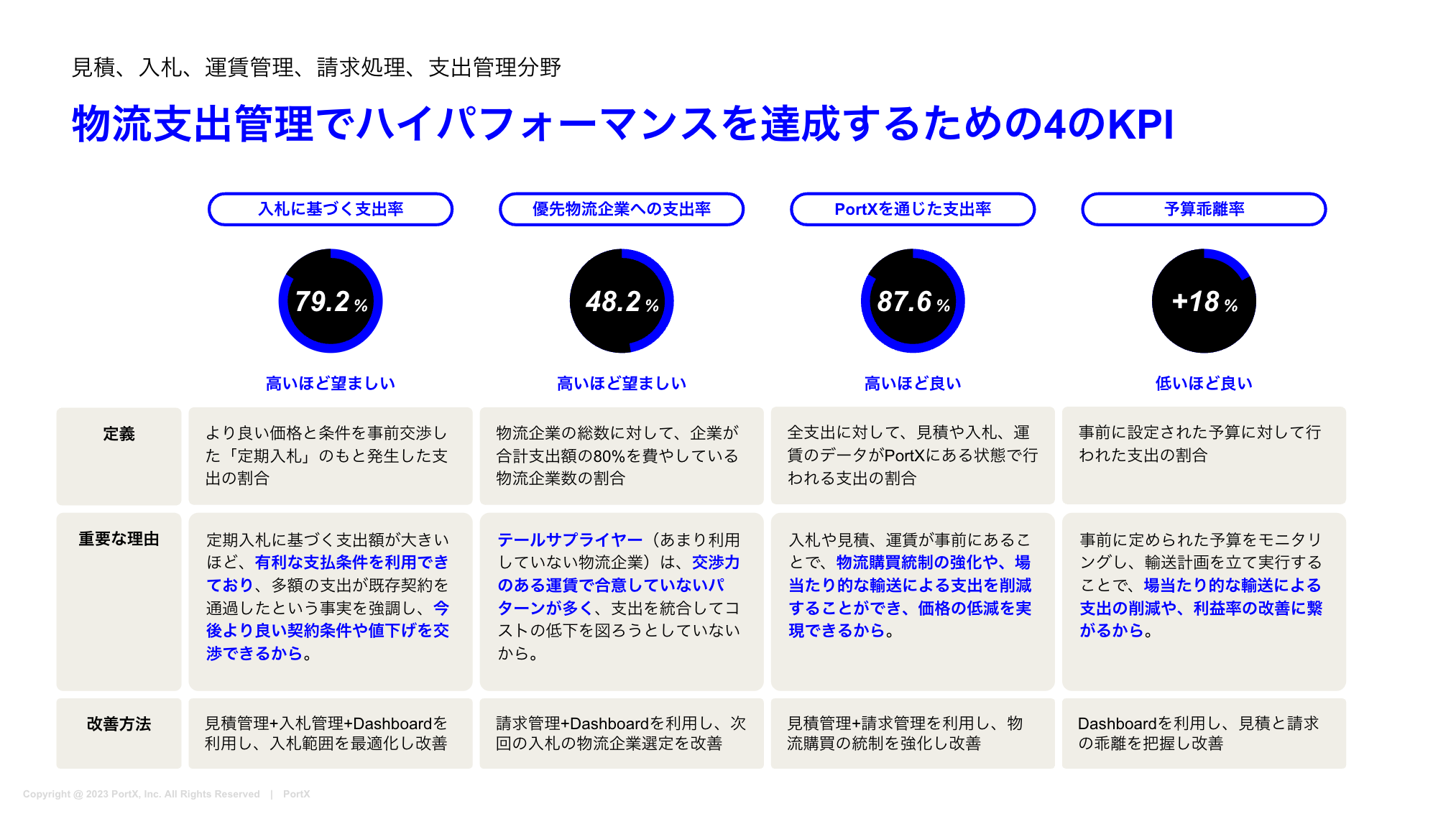 また包括的なアプリケーションの利用により、物流支出の最適化・削減を実現する複数のKPIsを常にモニタリングしていただくことが可能です。(詳細は下記画像を参照)