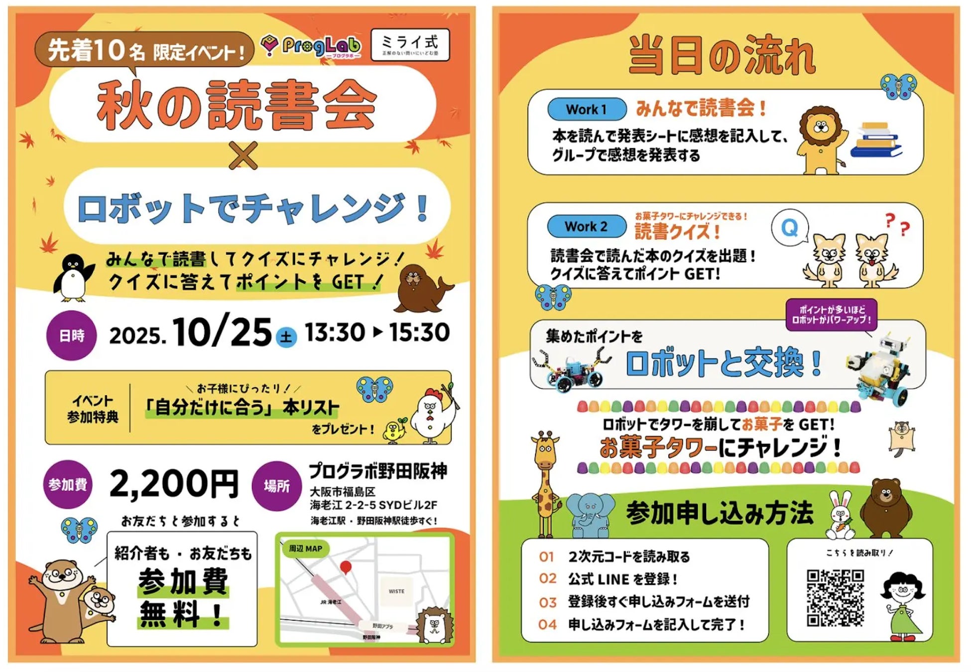考える力を身につける全科目先取り個別学習塾「ミライ式」(運営会社:株式会社TricoLogic)は、夢を実現するチカラを育む子ども向けロボットプログラミング教室「プログラボ」(運営会社:株式会社ミマモルメ、阪急阪神ホールディングスと読売テレビが協同で運営)と【秋の読書会×ロボットでチャレンジ】イベントを2025年10月25日(土)に開催します。