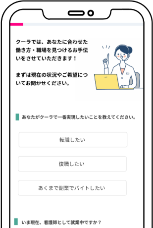 クーラは、潜在看護師(副業含む)等の医療従事者と周辺の医療機関を、単発から2ヶ月程度のスキマバイト・お試し転職をきっかけにマッチングする、完全成功報酬制・導入費0円の採用プラットフォームです。