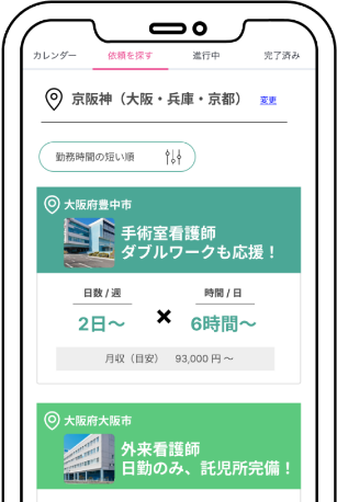 ・提携医療機関の業務領域や業務時間帯を切り出し、時短・短期のアルバイト求人を設定。最適な職歴を持つ医療従事者をシステムでマッチングします。