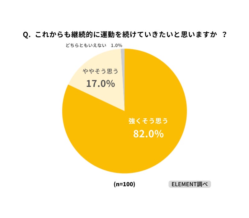 「これからも継続的に運動を続けていきたいと思うか」と聞いたところ、99%のかたが「そう思う」と回答しました。ELEMENTを通じて、運動習慣が形成できたことや、トレーニング方法を習得することができたために、こうした結果になったと考えられます。