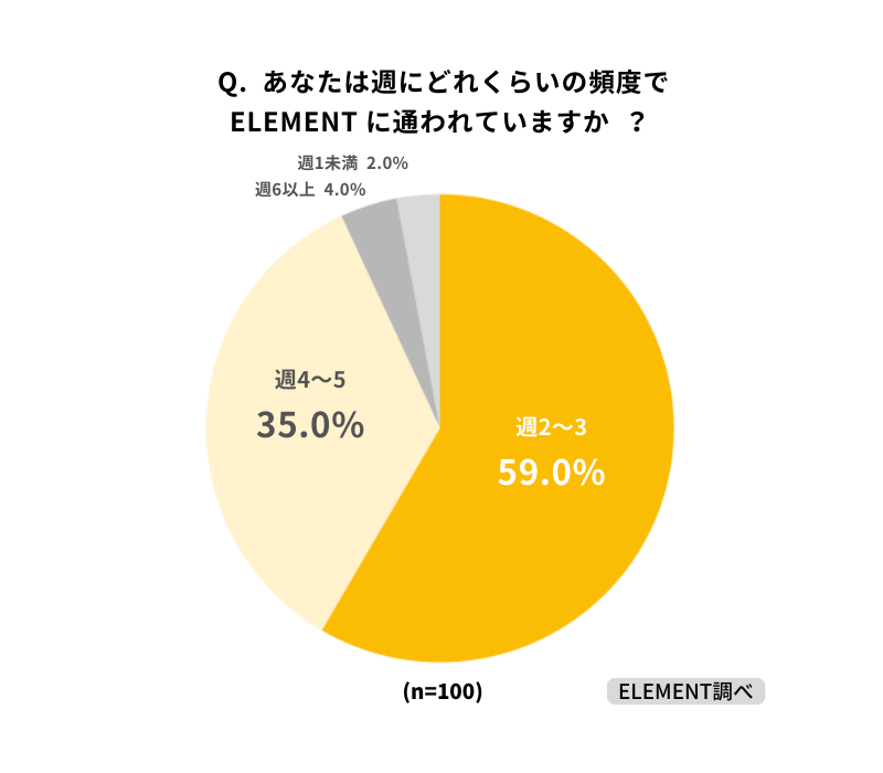 「ELEMENTに通う頻度」について聞いたところ、59%の方が「週2~3」、次いで35%の方が「週4~5」の頻度でELEMENTに通っていることがわかりました。ELEMENTは、パーソナルジムでは珍しい通い放題というシステムを採用していますが、その甲斐あり、9割以上の方が非常に高い頻度でELEMENTに通っていることが明らかになりました。ELEMENTに通う9割以上の方が、厚生労働省が定義する「運動の習慣化」を実現することができているということができます。